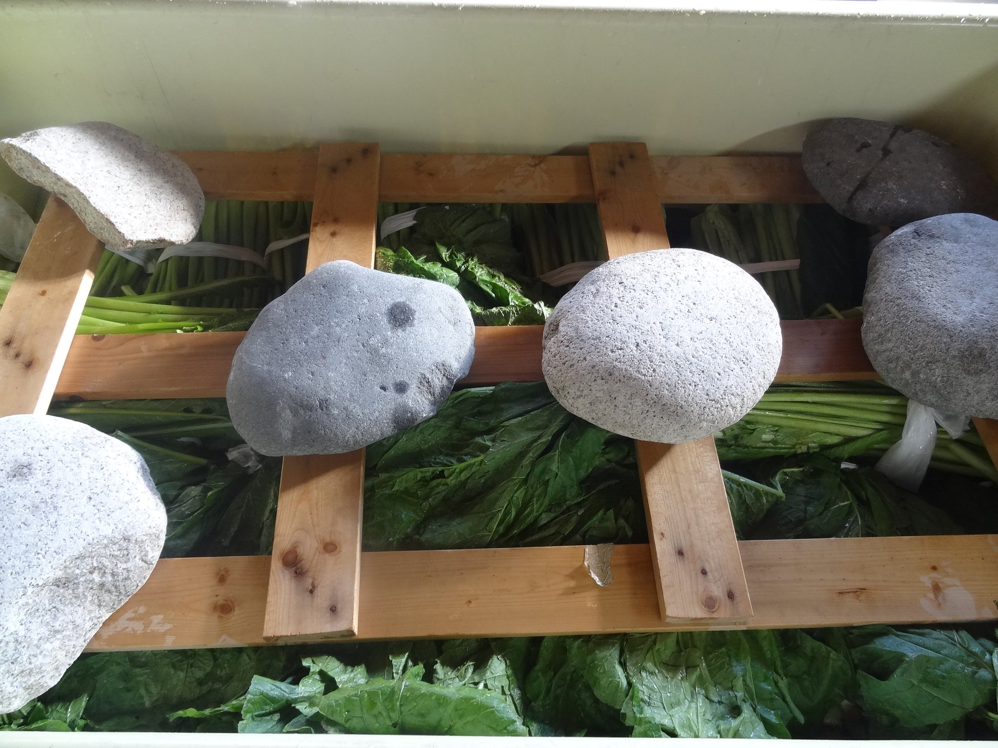 何よりの魅力は毎日食べても飽きることのない、単純にして奥深い味わい。塩漬けにして水分を出した野沢菜は、傷んだところは一本一本丁寧に取り除いてから、漬物にしております。